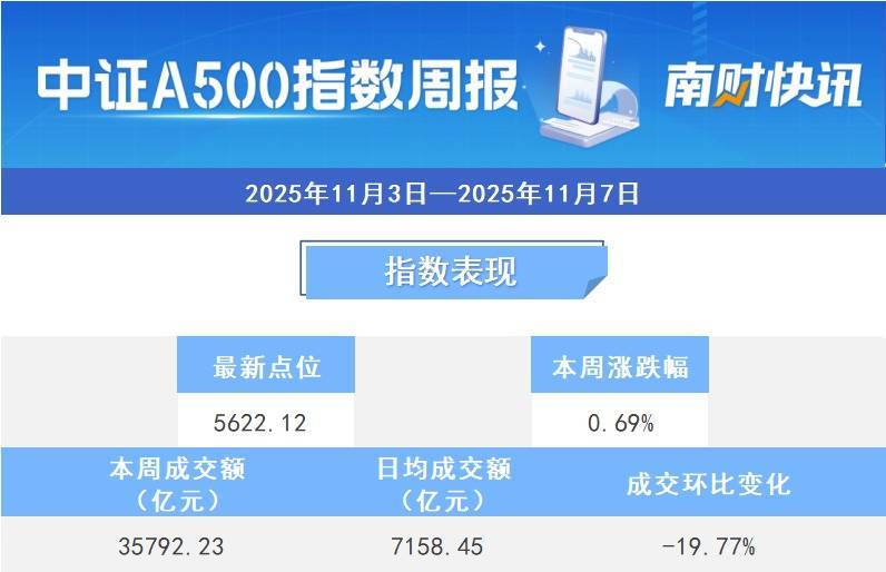 本周中证A500指数上涨0.69%,截至11月7日收盘,报5622.12点。本周日均平均成交额为7158.45亿元九融配资,单日成交额环比下降19.77%。