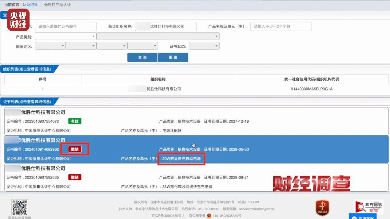 记者登录公共服务平台查询发现,产品标注的优胜仕科技有限公司仅有的一张移动电源3C认证证书已处于撤销状态,充电宝型号也对不上,且产品机身的核心信息无中文,属于禁止销售的充电宝产品。